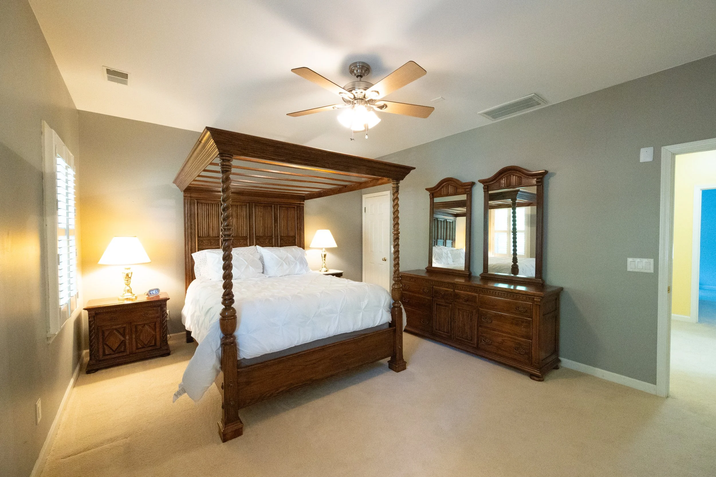 This inviting space features a plush king bed, providing the perfect sanctuary for restful nights and dreamy escapes. Adjacent to the bedroom, a shared bathroom awaits, offering convenience and privacy for a truly serene stay. As the sun sets over Lake Murray, the room comes alive with warm hues, offering a serenade of relaxation and comfort.